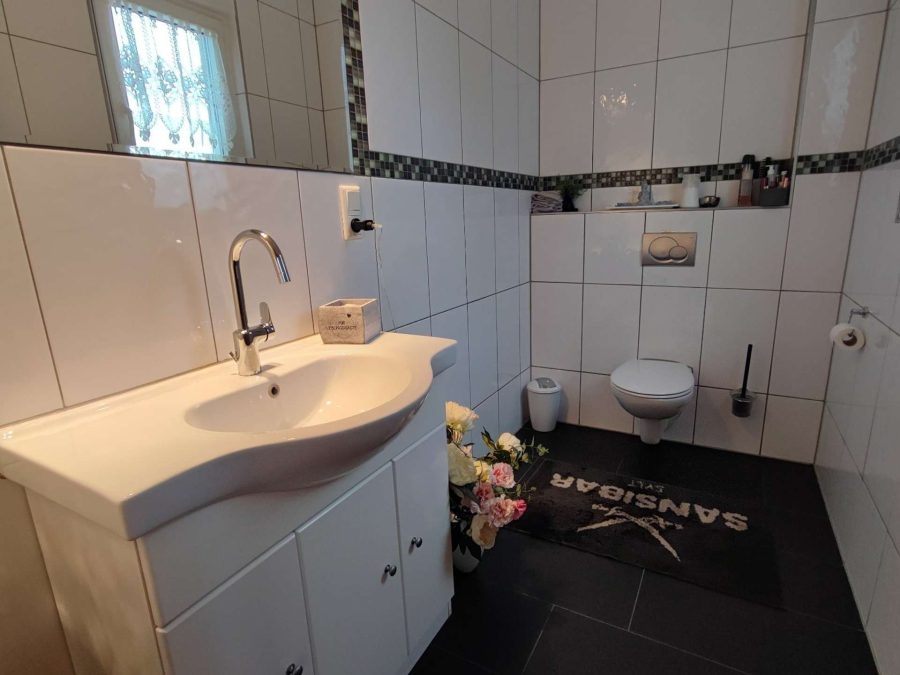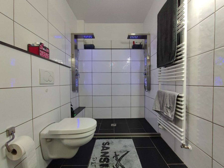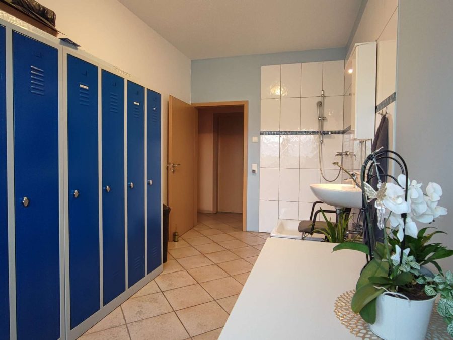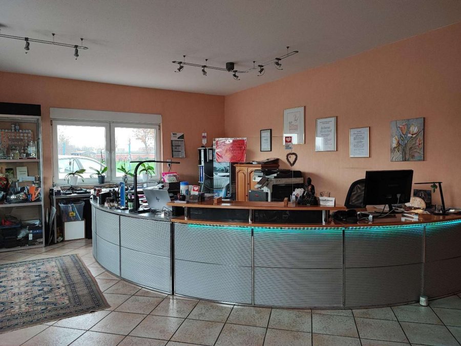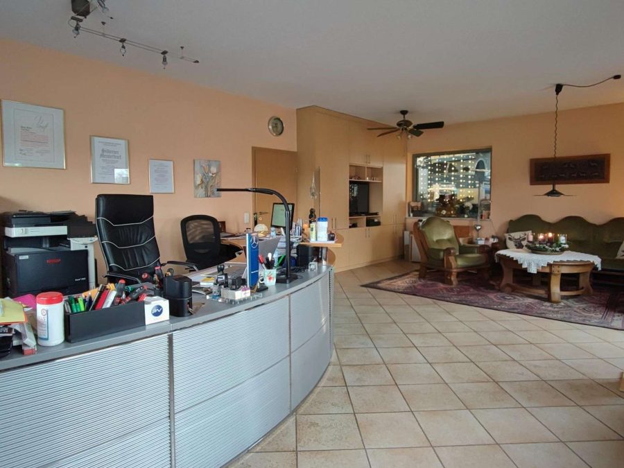 Bereits im Eingangsbereich befindet sich ein repräsentatives Büro mit Empfangsbereich, das einen professionellen ersten Eindruck vermittelt. Für den laufenden Betrieb stehen zudem eine separate Umkleide sowie eine Küche für Mitarbeiter zur Verfügung. Abgerundet wird der Gewerbeteil durch zwei Kunden WCs, getrennt für Damen und Herren, die den funktionalen und professionellen Charakter der Immobilie unterstreichen.